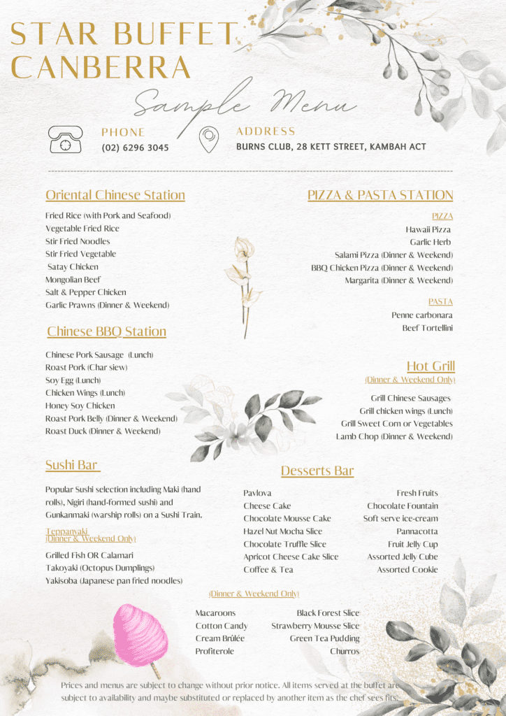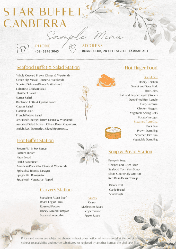 Located inside the Burns Club, conveniently located at 8 Kett Street, Kambah ACT. Star Buffet offers you great value gourmet buffet, ranging from Australian, Asian and European cuisine, roast duck and BBQ pork plus all your favourite seafood and roasts, not to mention the many tempting desserts in a relaxed and friendly atmosphere. With seating up to ~550 people. No Party or Event is Too Big or Too Small for us to Cater!